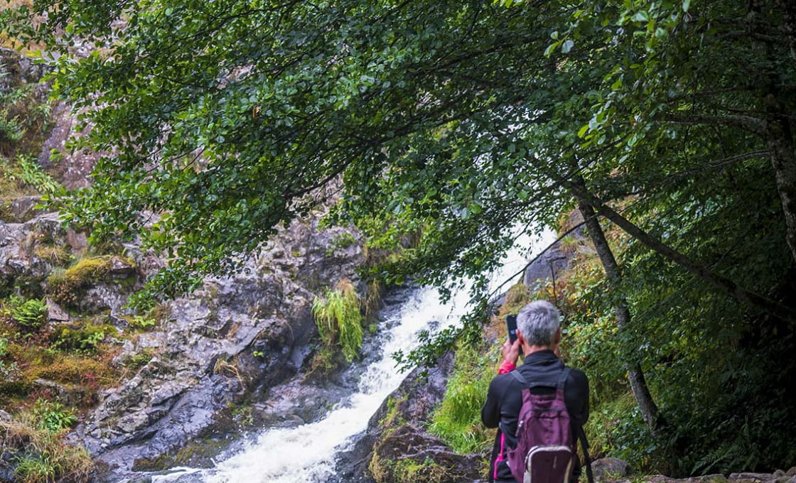 Le chemin d’accès est bordé d’anciens murets de pierres moussues, de feuillus et de conifères, ce qui donne à cet endroit un caractère authentique et mystérieux. Une cabane sonore est installée près de la rivière pour amplifier ce “gloussements d’eaux vives”.