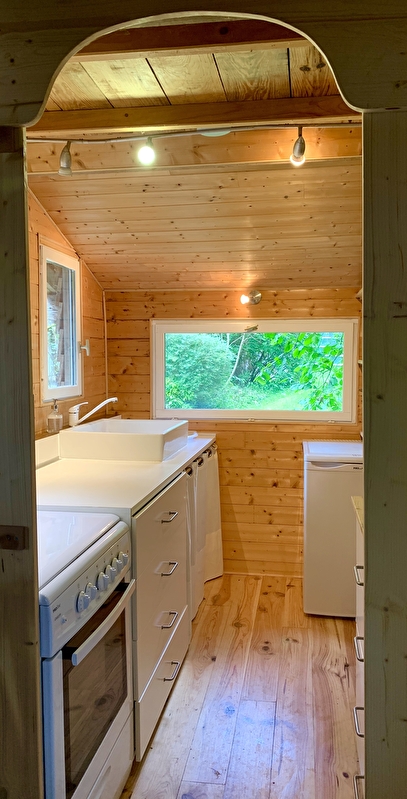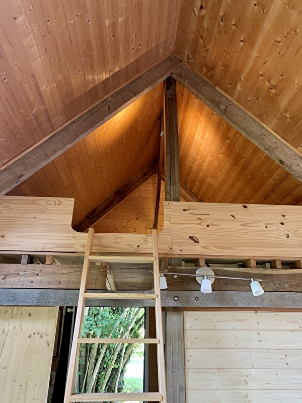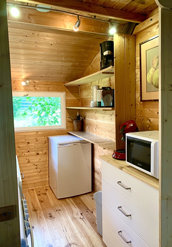 Il comprend un espace salon-salle à manger doté d'un canapé-lit pour deux personnes et un poêle à bois, une salle d'eau avec toilettes, une cuisiné aménagée et une mezzanine équipée de deux lits individuels. Vous bénéficierez de tout le confort nécessaire pour vous détendre et couper de votre quotidien. Appréciez la nature environnante et profitez de ce séjour pour vous ressourcer et recharger les batteries.